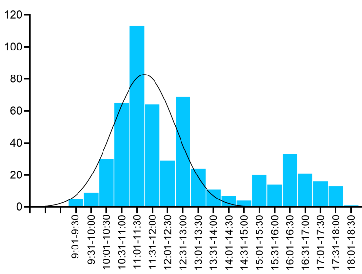 The trial also did not show an expected distribution of infusion times across clinic hours. Instead, infusion times cluster heavily between 9-12:00pm, then resume between approximately 3-6 pm with a striking three-hour gap in between. There are essentially incredibly few infusions between 12:00-3pm.